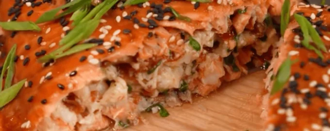 Tento recept je jedlo, ktoré si podmaní svojou vyváženosťou jemnosti a intenzívnej chuti. Šťavnatý losos, voňavá plnka z kreviet a špenátu, husté suluguni a lesklá poleva z teriyaki omáčky – toto jedlo sa doslova rozplýva v ústach. A navyše je hotové za menej ako pol hodiny.