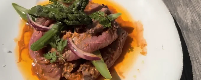 - Hovädzie plátky naaranžujte na tanier v tvare ruže a vedľa nich položte špargľu. Zalejeme dresingom, posypeme soľou a podľa potreby pridáme niekoľko plátkov nakladanej červenej cibule.