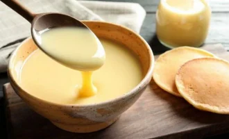 - Na krém vyšľaháme kyslú smotanu v miske mixérom po dobu 2 minút. Potom postupne pridáme kondenzované mlieko a premiešame.